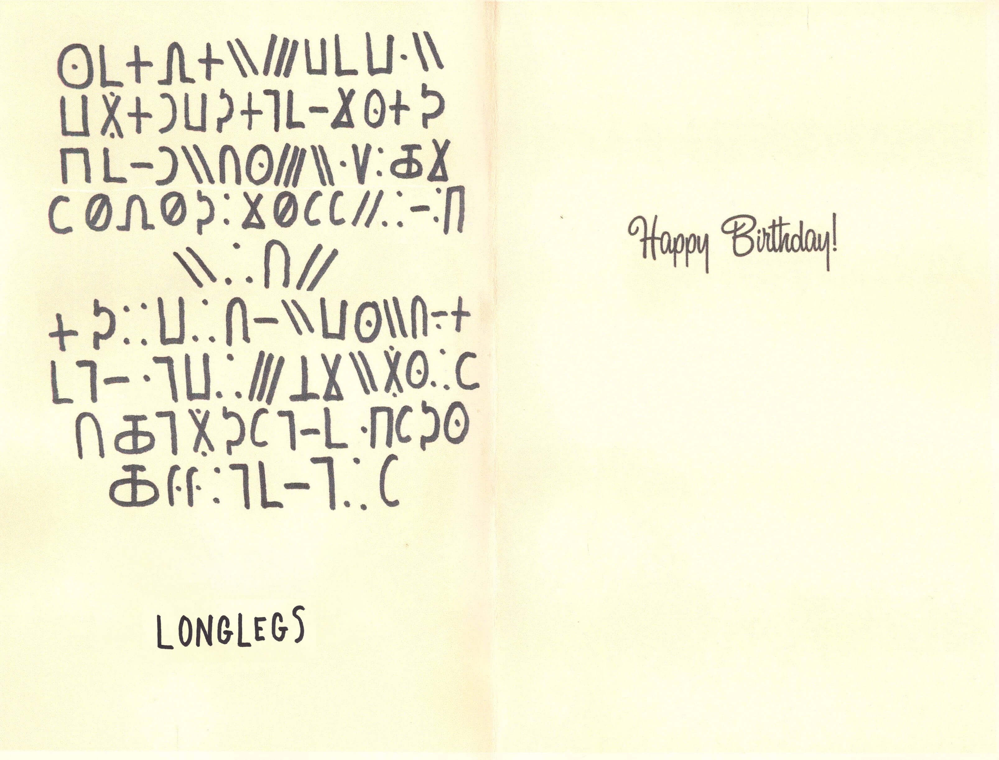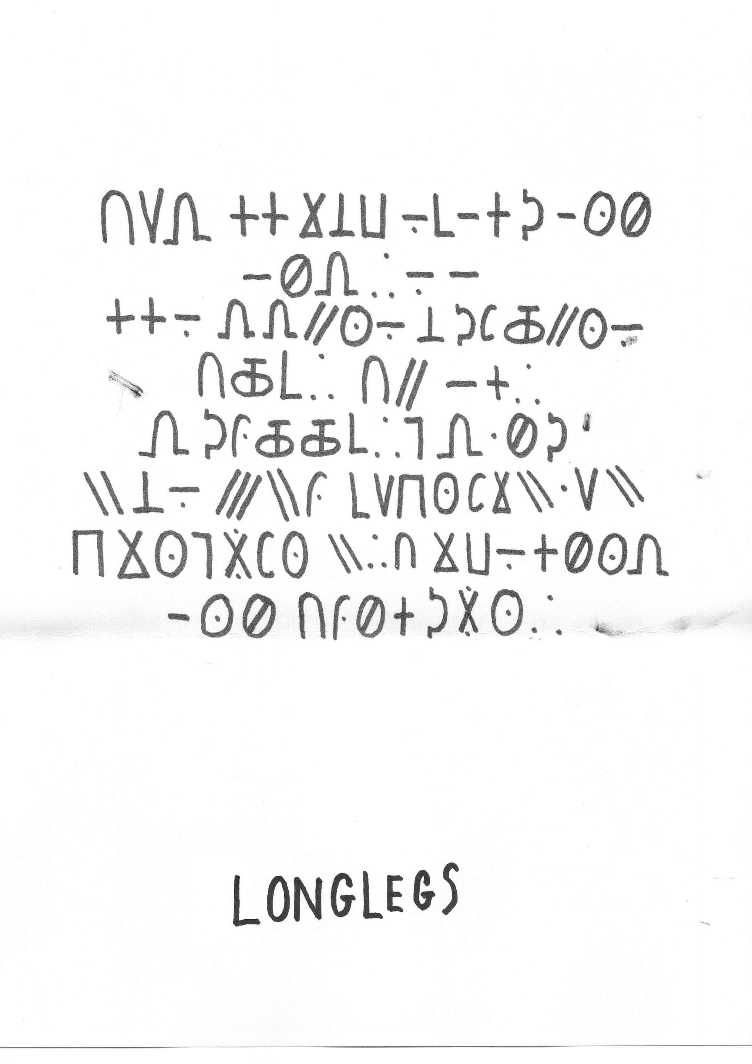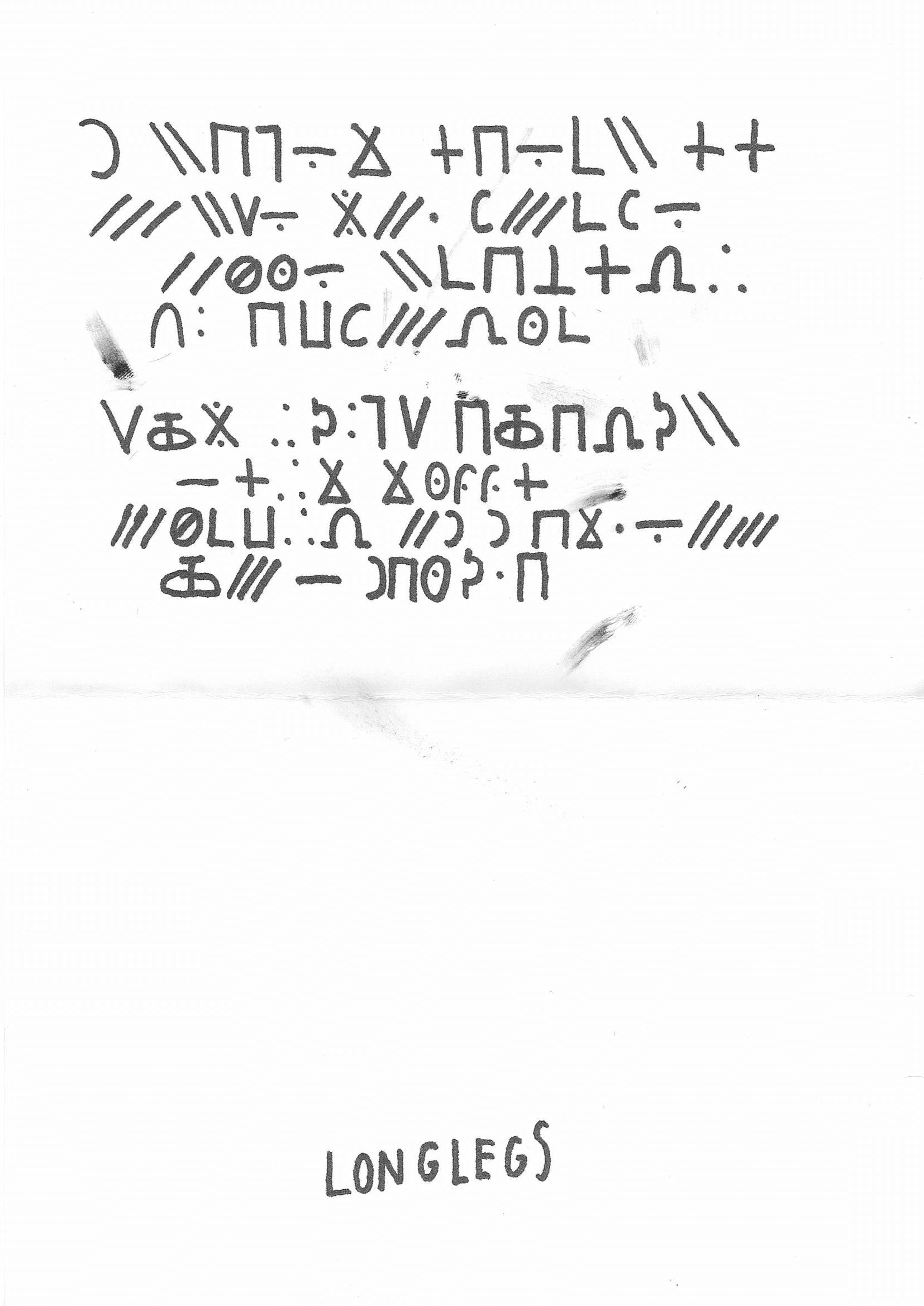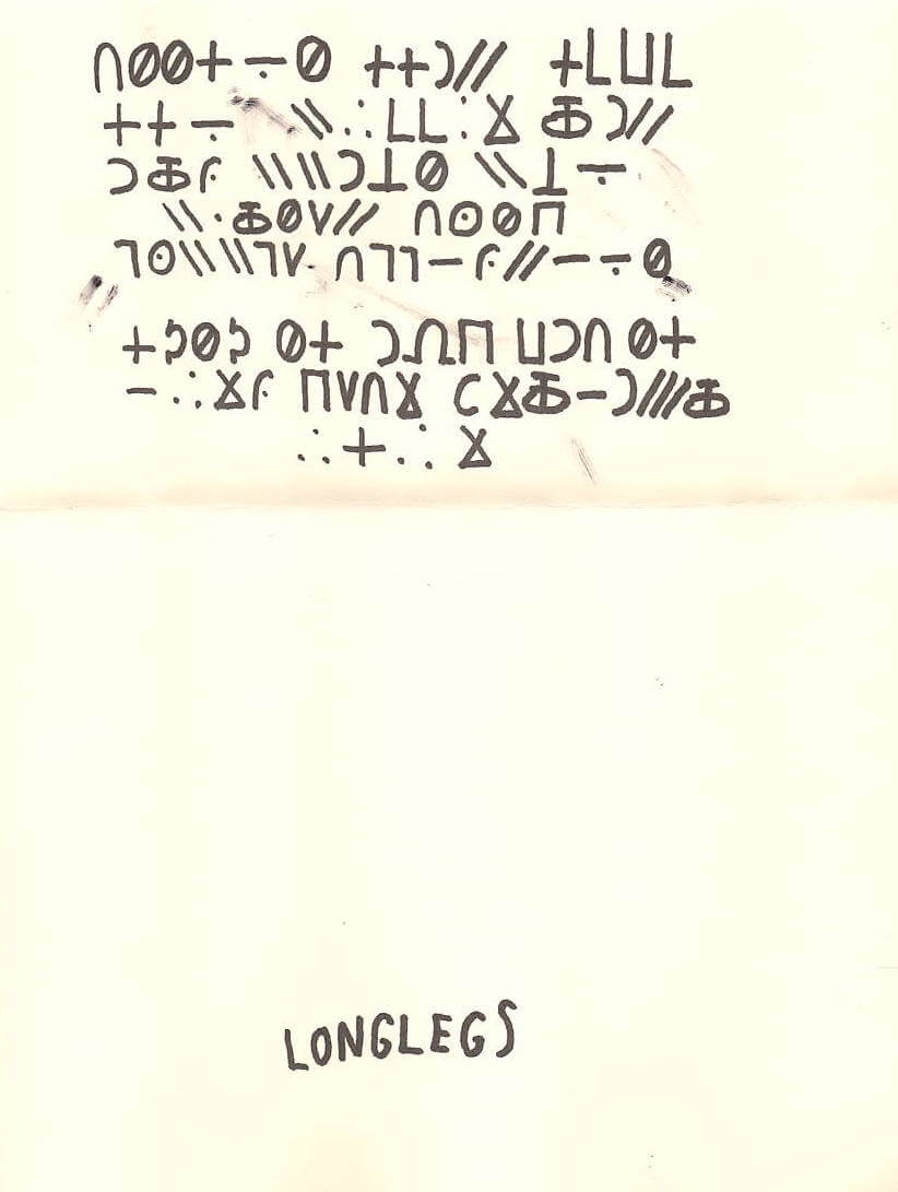 家の内壁は様々な逆三角形で飾られていた。枕元には、スコットランドの人類学者、サー・ジェイムズ・ジョージ・フレイザーの著書『金枝篇』が、187ページを開いた状態でベッドの枕元に置かれていた。冷蔵庫には、暗号メッセージが刻まれたバースデーカードがあった。カードへの署名は... ロングレッグス