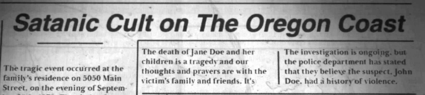 また来週。悪魔の脅威を追う我々の調査は続く。 オングストローム家ウォーレンとヴィヴィアン・オングストロームは結婚してほぼ10年。セーレム市裁判所の公証人であったウォーレンは、ウェスト・ステイトンのシェナニガンズ・レーンでボウリングをしているときにヴィヴィアンと出会った。2人はすぐに結婚し、エルクホーンに移り住んだ。夫妻は毎年春にはヤムヒル川での釣りを楽しんだ。一人娘のポリーは9歳で、ロニー・エラム小学校に通っており、無残に殺される少し前に今月の最優秀児童に選ばれていた。 娘は12インチ(約30センチ)の肉切り包丁で40回以上刺されていた。顔は死後に野菜ピーラーで削り落とされていた。ヴィヴィアン(34)は腹から骨切り包丁が突き出た状態で血の海の中で発見された。ウォーレン(38)はスクリュードライバーで両目をえぐり取った後、自分の手首を切っていた。 1972年11月17日未明、ベイロック通りのオングストローム家のドアをノックした巡回セールスマンからの通報を受けて、警官たちが駆けつけた。トラビス・ホプソン警部補は、「ウォーレン・オングストロームが犯人だとはまったく信じられなかった」と言っている。しかし、すべての証拠がそれを裏付けているため、事件は無理心中殺人と断定された。「誰か、あるいは何かが彼にそうさせたのだ。彼が自分の意志でやってはいない」 とホプソンは付け加えた。ウォーレンを知る者は皆、彼は普通の家庭人であったという。にもかかわらず、彼の家族に起こったことは、まったく普通ではなかった。