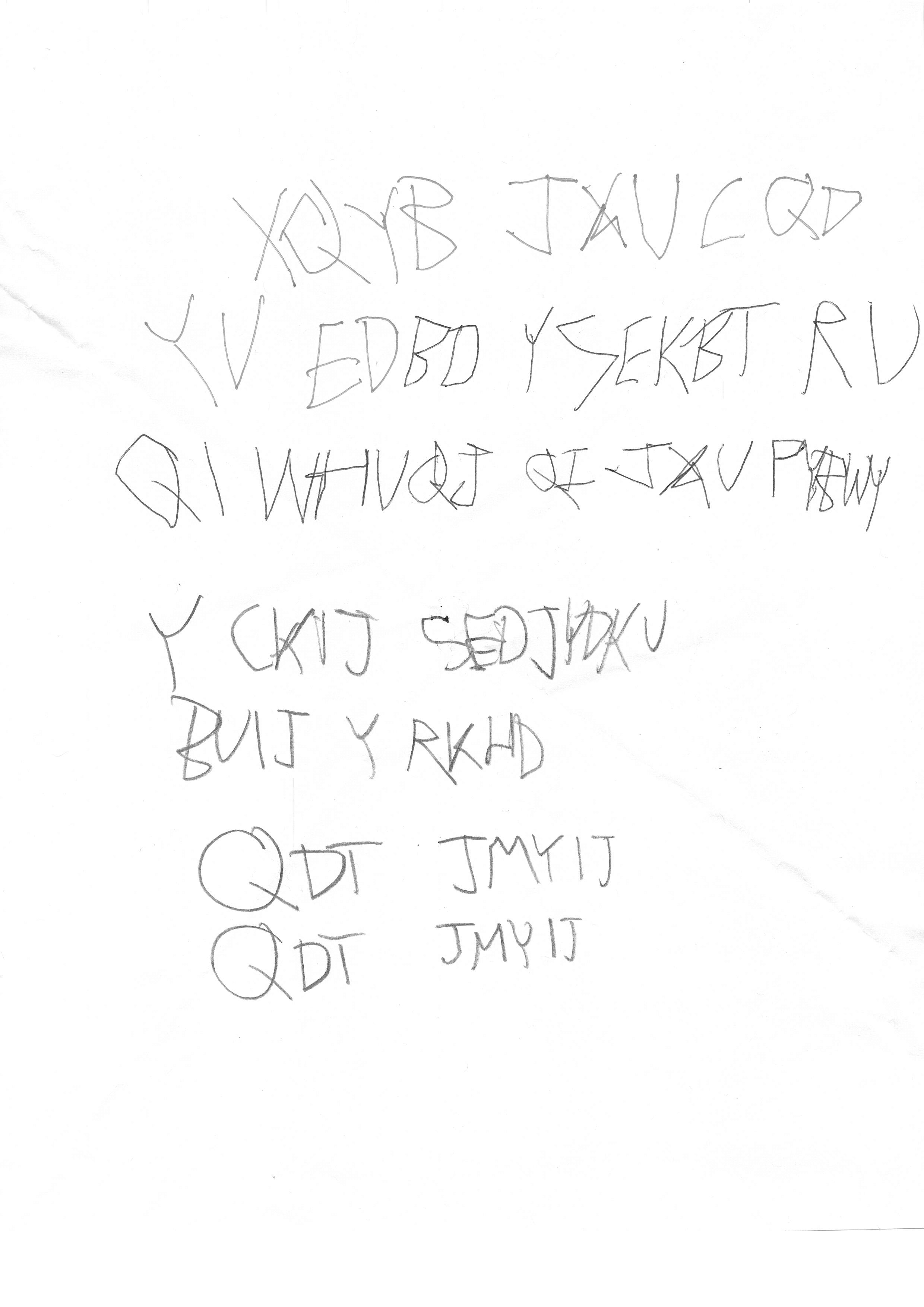 冷蔵庫でピンクの封筒に入った手紙が見つかった。暗号化されたアルファベットで書かれており、